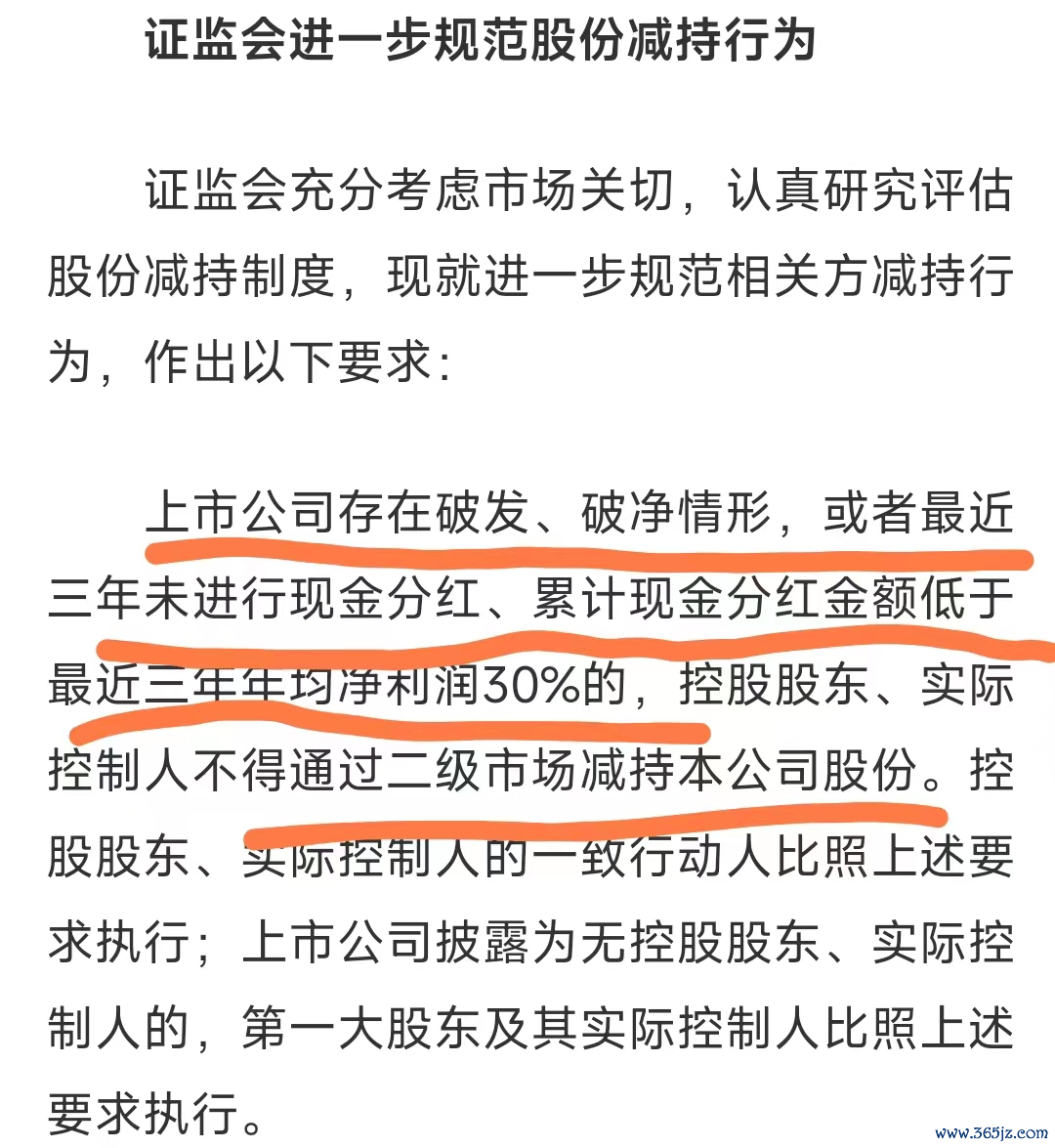 没想到之前谈到的限制股东减持还真实现了,证监会这个可太良心了,三年没分红或者分红金额小于净利润30%的,控股股东不能二级市场减持。希望这条严格实行,并且不要给那些公司钻空子机会,比如说离婚减持,让二股东三股东减持。