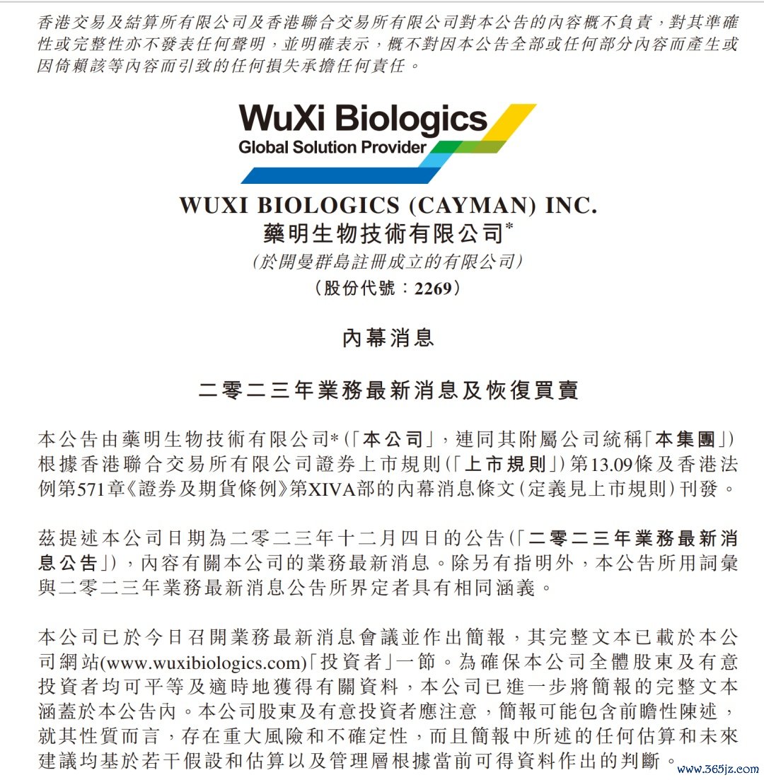 12月4日深夜,药明生物发布公告,表示集团的业务营运及财务状况维持强劲势头,且其业务营运及财务状况并未发生重大不利变动。尽管生物技术融资放缓导致生物技术行业呈个位数年增长率,且其COVID-19相关项目的收入下降及几个重磅药的生产延期,导致2023年目标收入增长低于预期,但公司仍对未来前景保持乐观,2023年实现整体收入约10%增长,并将继续投资提升能力及产能,以在2024年及2025年保持强劲的毛利率及增长率。展望未来,公司相信毛利率及增长率于2023年最具挑战,并预期于2024年下半年逐步回暖。12月5日起,药明生物股票恢复买卖。