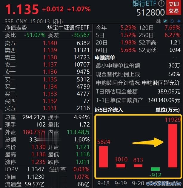 ETF资金方面,以顶流银行ETF(512800)为例,其最新单日再获资金大幅净申购1.19亿元,最近5日资金累计净流入1.87亿元,拉长时间看,银行ETF(512800)近10日有8日获资金增仓,累计吸金达4.21亿元。